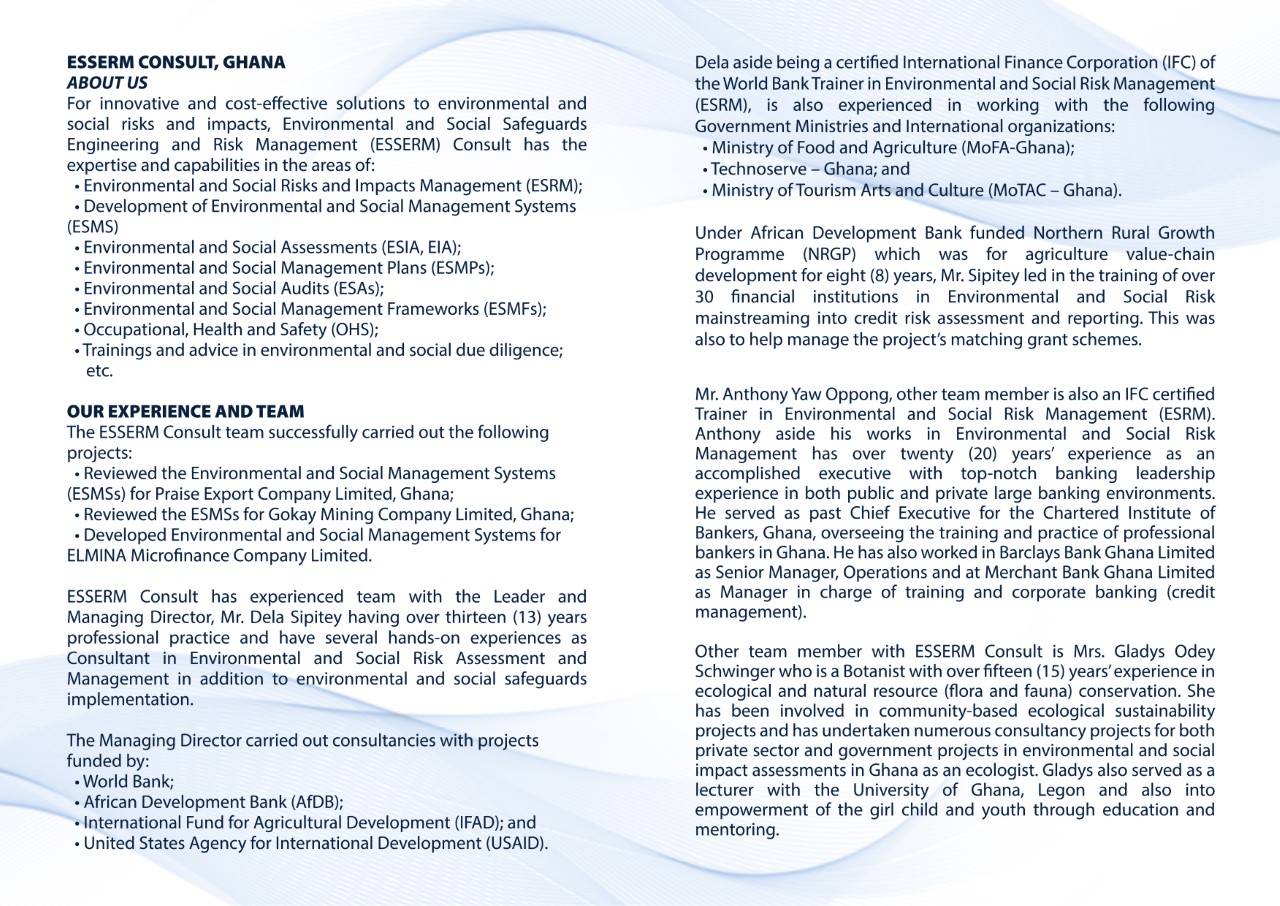 ESSERM Consult has experienced team with the Leader and Managing Director, Mr. Dela Sipitey having over fifteen (15) years professional practice and have several hands-on experiences as Consultant in Environmental and Social Risk Assessment and Management in addition to environmental and social safeguards implementation.